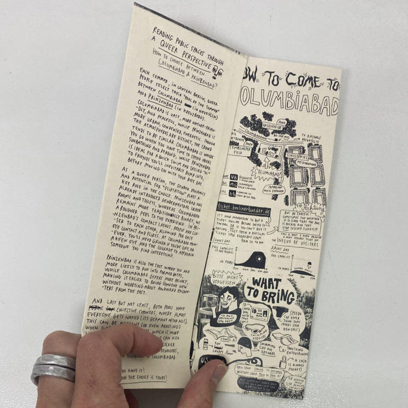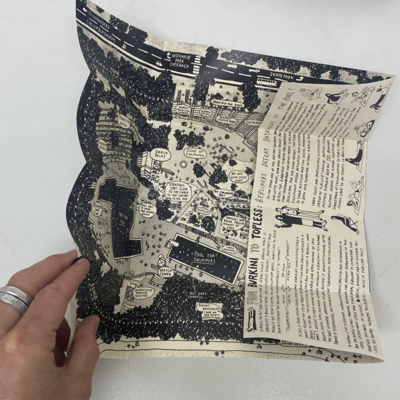 Le fanzine se déplie en une grande carte de la piscine, au format A3.